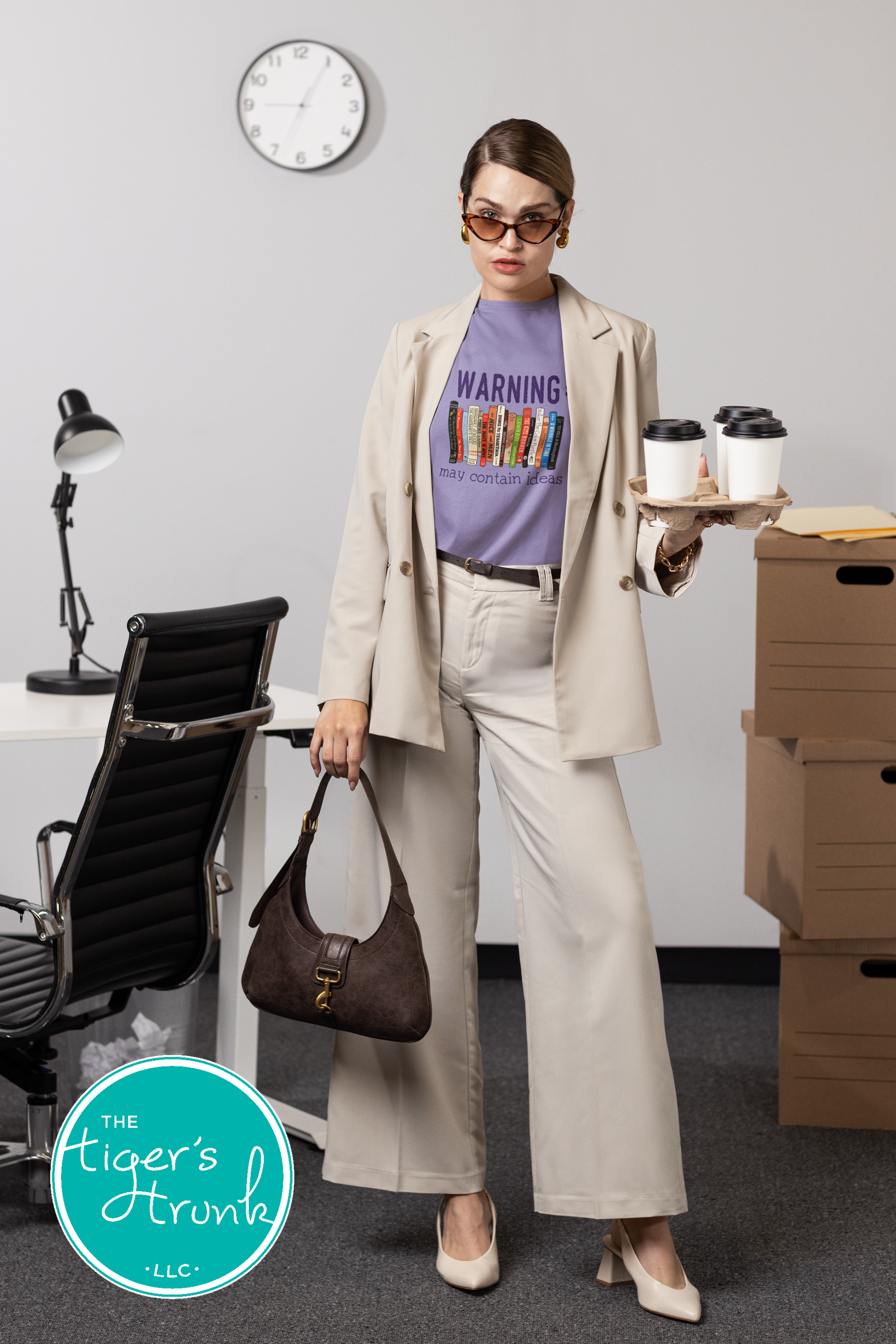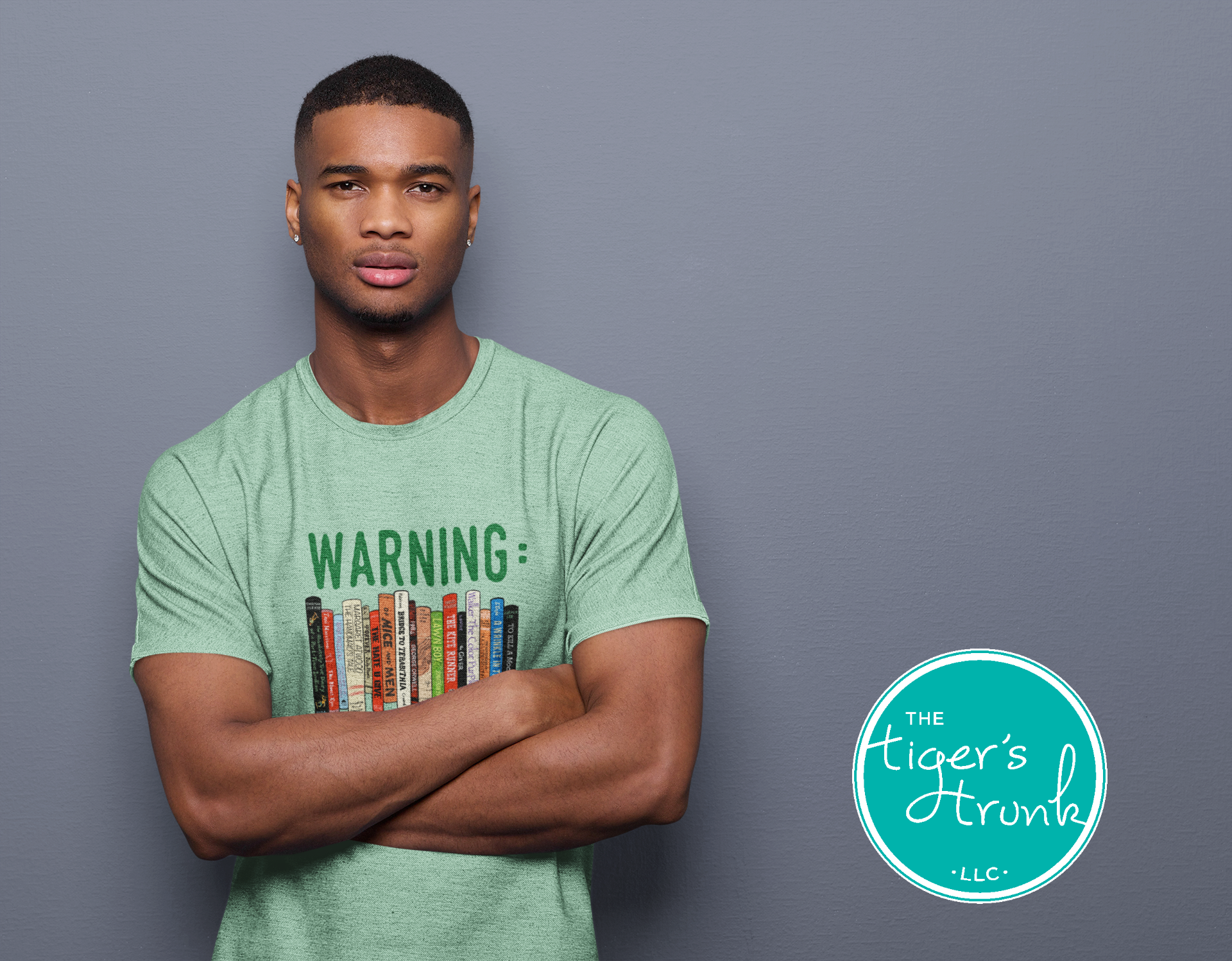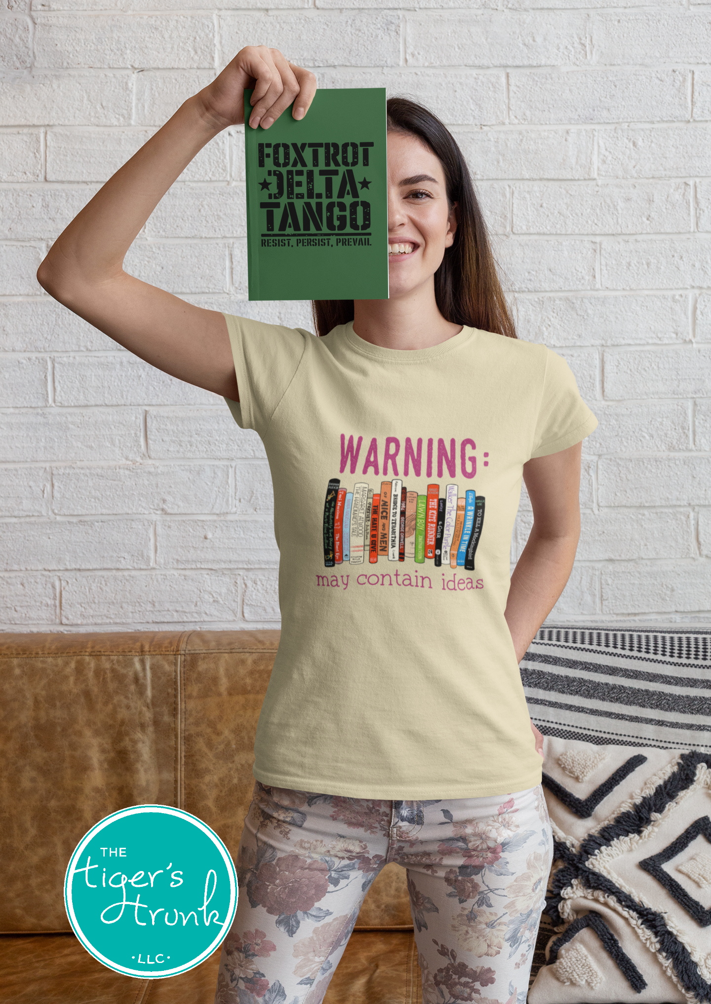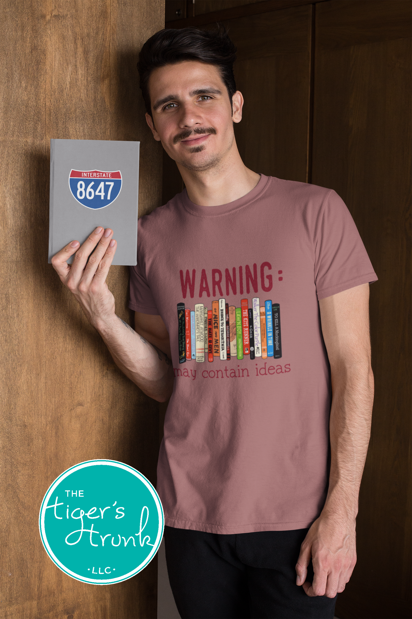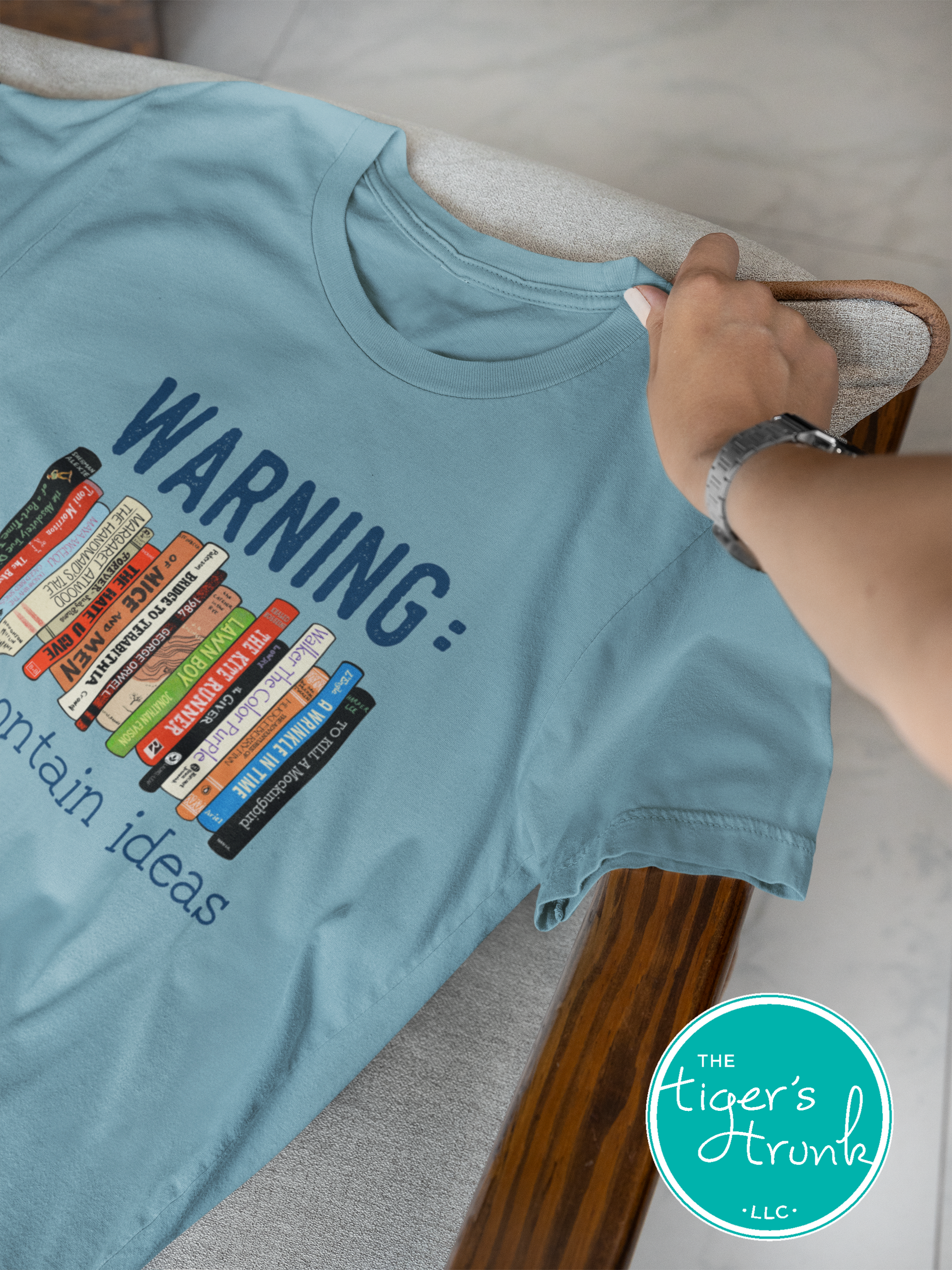 Make a bold literary statement in this Warning: May Contain Ideas banned books graphic t-shirt. Featuring imagery of censored titles and a striking call for intellectual freedom, this shirt is a must-have for readers, teachers, librarians, and anyone who defends the right to read. Ideal for Banned Books Week or everyday wear, this shirt sparks conversation and shows that ideas—especially the banned ones—deserve a place on every shelf.