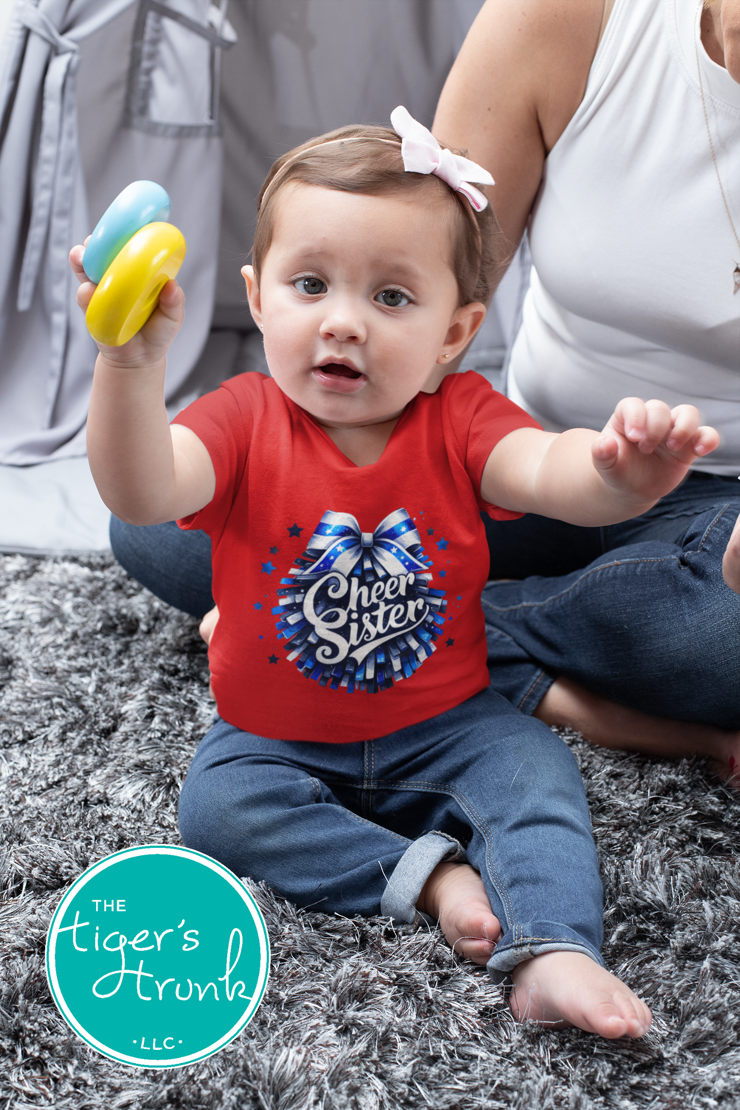 Let her show off her cheer pride in this Cheer Sister shirt, designed in bold team colors of red, blue, and white. Whether she’s in the stands or on the sideline, this unisex youth tee is available in royal or navy with optional silver accents for an extra pop of sparkle. Perfect for pep rallies, competitions, and every spirited moment in between.