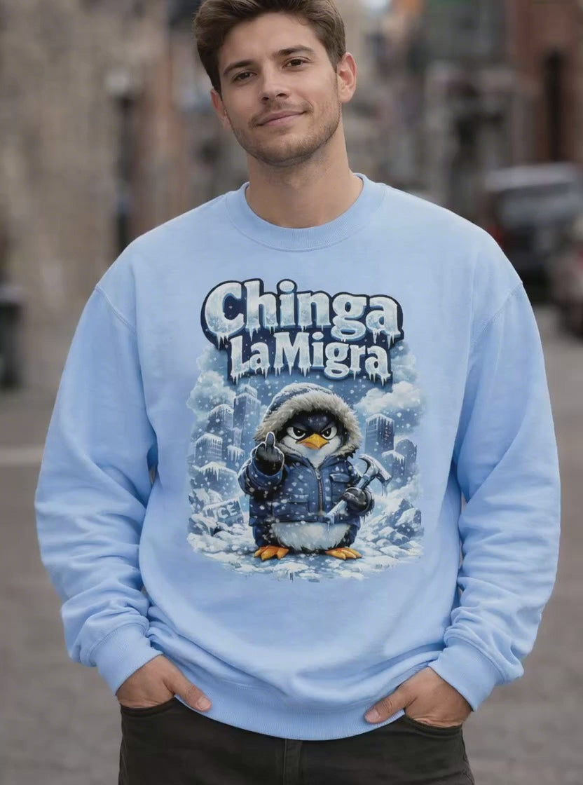 This Chinga La Migra penguin sweatshirt delivers a clear anti-Donald Trump and anti-ICE message through bold protest artwork designed to stand out in any crowd. The winter-themed illustration pairs icy visuals with strong pro-immigration symbolism, creating a statement piece that reflects resistance, activism, and solidarity. Available in black, ash, and light blue, this graphic protest sweatshirt is made for everyday wear while remaining loud in message and intent. Whether worn to rallies, marches, or as part of a daily activist wardrobe, this crewneck represents opposition to oppressive immigration policies and support for immigrant communities.