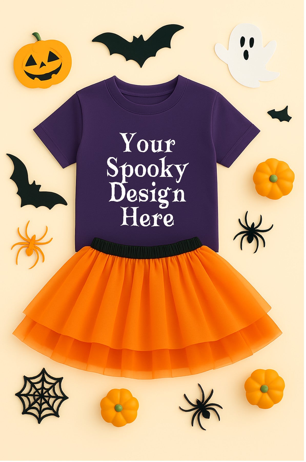 This Halloween mockup highlights a youth purple shirt styled with an orange tutu in a spooky seasonal flat lay. Designed for apparel shop owners and graphic designers, this high-resolution digital file makes it easy to present festive children’s Halloween shirt designs with a polished look.