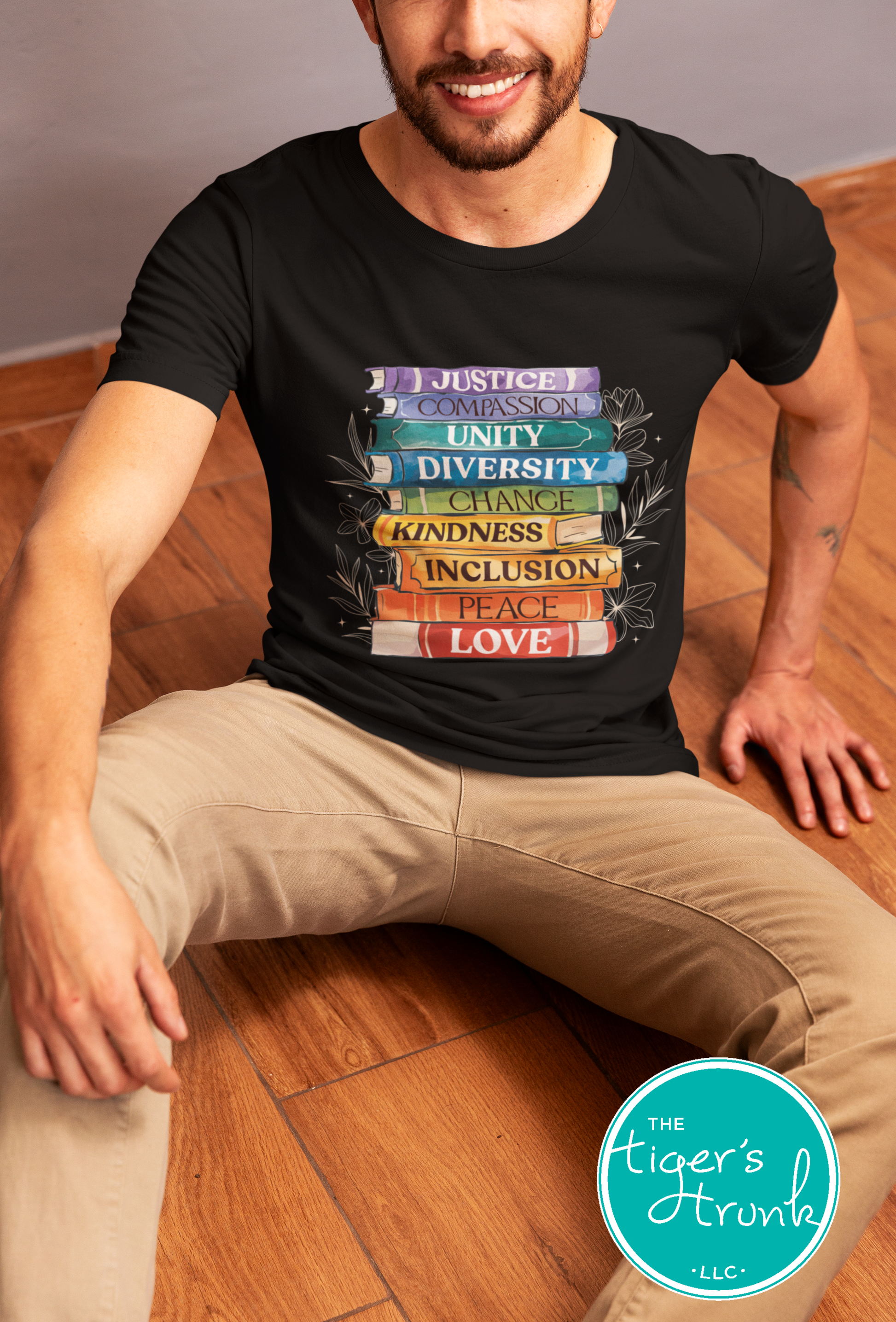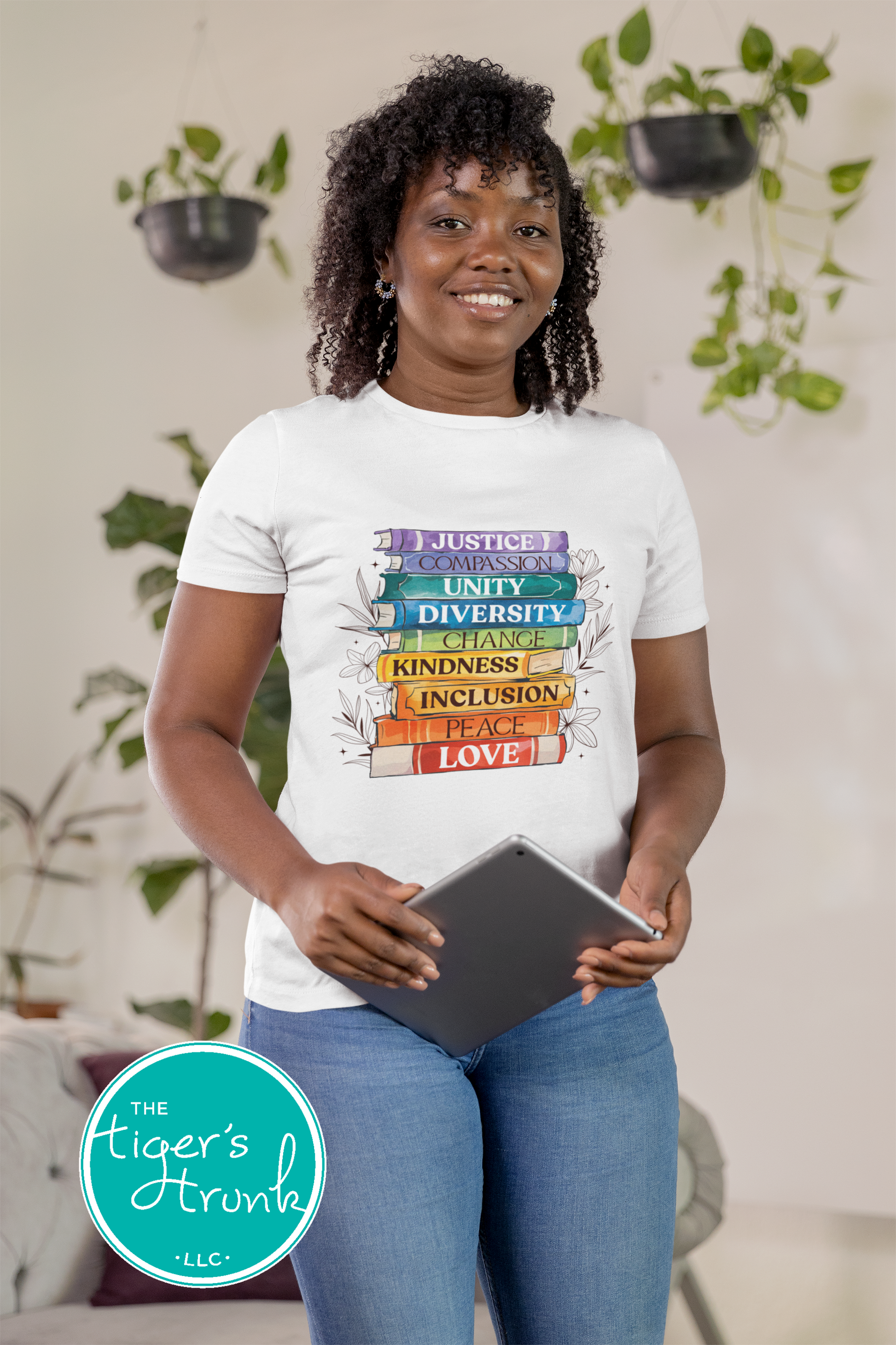 Celebrate warmth, wisdom, and pride in this Rainbow Book Stack sweatshirt featuring eight colorful books stacked tall with powerful words: Justice, Compassion, Unity, Diversity, Kindness, Inclusion, Peace, and Love. Ideal for cozy days, classroom wear, or standing in solidarity, this sweatshirt spreads positivity and allyship wherever you go. It’s a meaningful, colorful option for LGBTQ+ advocates, book lovers, and educators alike. Also available as a t-shirt.